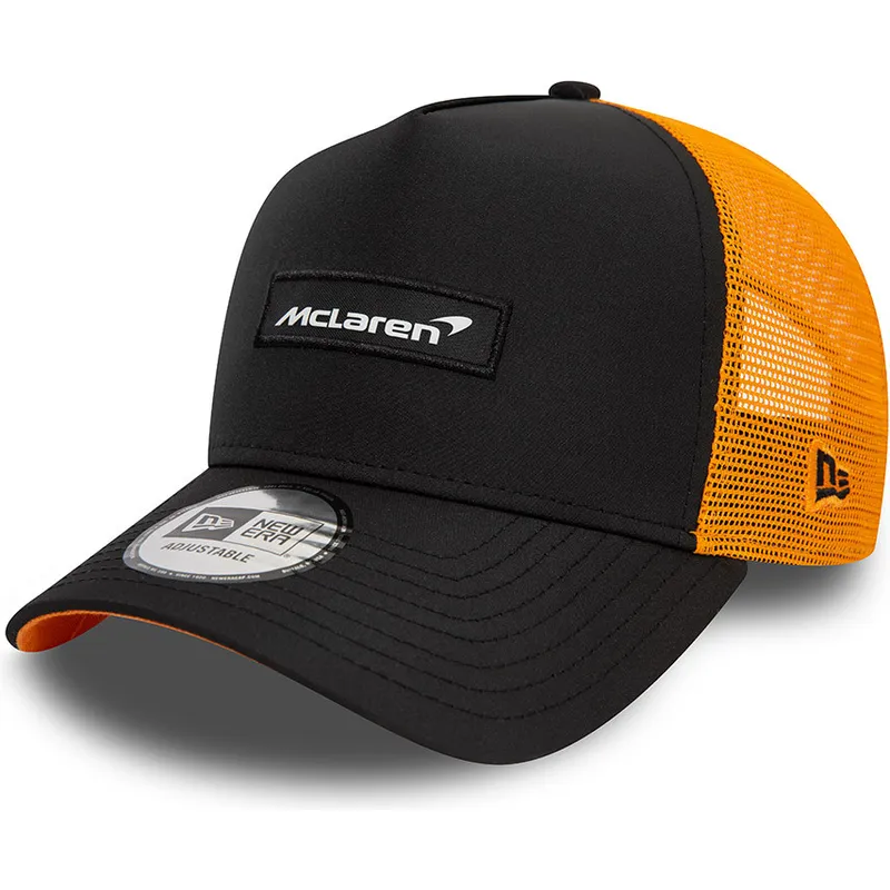 McLaren Racing Formula 1 sort og orange 9FORTY A Frame Patch Front trucker cap fra New Era er et must-have tilbehør for fartelskere. Med McLaren Racing-logoet broderet foran er denne kasket perfekt til at vise din passion for holdet ved enhver lejlighed. Snapback-lukningen sikrer en perfekt pasform til enhver hovedstørrelse, mens dens unisex-design gør den velegnet til både mænd og kvinder.