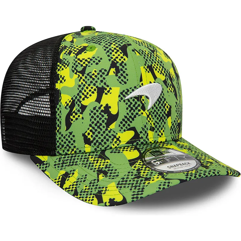 New Era McLaren Racing Formula 1 9FIFTY camouflage trucker kasket er et must-have stykke for enhver fan af det ikoniske Formel 1 team Med et unisex og moderne design er denne kasket perfekt til voksne, der ønsker at vise en sporty og urban stil. Snapback-lukningen giver dig mulighed for at justere den til den ønskede størrelse, hvilket garanterer komfort og en perfekt pasform til enhver tid.