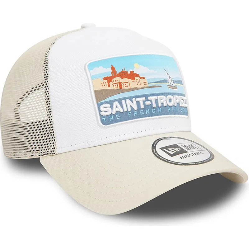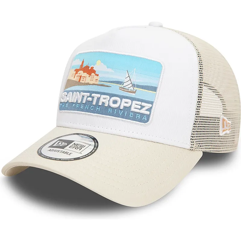 Saint-Tropez Cities and Beaches A Frame Summer beige trucker cap fra New Era er uden tvivl et must-have til denne sæson. Med New Era-logoet broderet foran er denne kasket ikke kun et modetilbehør, men også et symbol på stil og kvalitet. Den beige farve på denne kasket giver den et strejf af elegance og sofistikering, perfekt til dem, der leder efter et mere raffineret look.