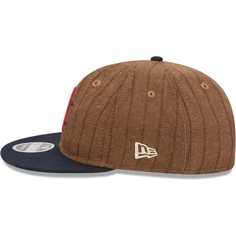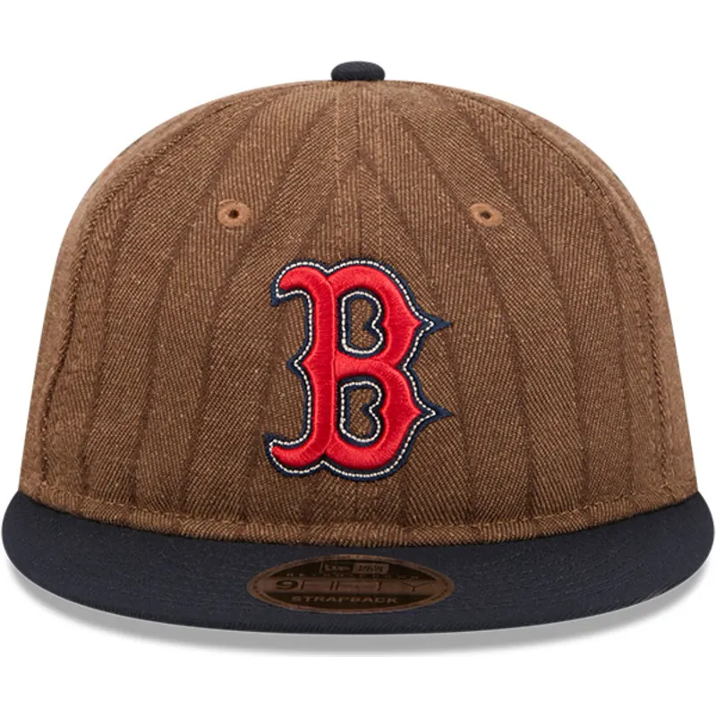 Kaskettens design skiller sig ud ved sin kombination af brune og marineblå toner, hvilket giver en meget elegant retro-følelse, ideel til dem, der søger en anderledes stil inden for det omfattende katalog af officielle Boston Red Sox-produkter. Uldteksturen med fine pinstribede linjer tilføjer en sofistikeret detalje, typisk for New Eras kollektioner, der blander tradition med aktuelle trends. Denne kasket afspejler ikke kun holdets ånd, men tilbyder også holdbarhed og komfort til hverdagsbrug eller ved sportsbegivenheder.