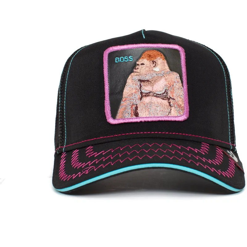 Goorin Bros. Gorilla Boss Barrel Boss The Farm sort-lyserød truckerkasket er en kasket, der perfekt komplementerer enhver modestil. Dens unisex-design gør den velegnet til både mænd og kvinder. Kasketten har en snapback-lukning for nem og komfortabel justering, hvilket gør den perfekt til heldagsbrug. Derudover tilføjer den broderede patch på forsiden et strejf af sofistikering og elegance.
