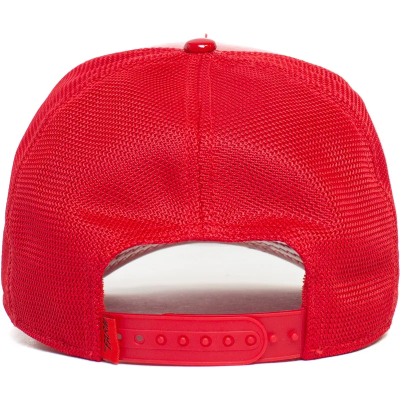Goorin Bros. Cock Big Red Patent Leather The Farm red rooster trucker-kasket har et dristigt og iøjnefaldende design, der afspejler bærerens personlighed. Den broderede mærke på forsiden af hatten er af høj kvalitet og omhyggeligt syet. Desuden tilføjer den kunstige læderfinish et strejf af elegance og sofistikering til beklædningsgenstanden.